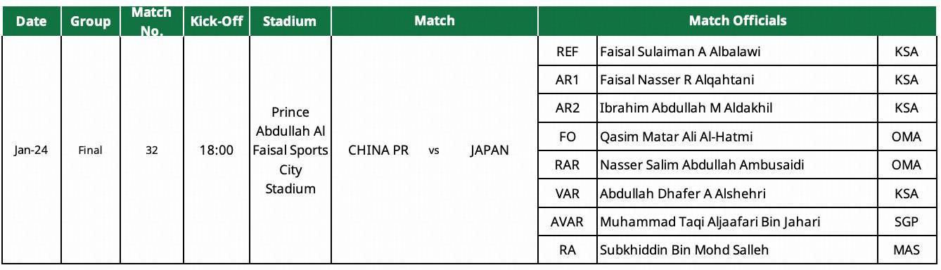 北京时间1月24日晚23点,2026年U23亚洲杯决赛,中国U23vs日本U23。赛前,亚足联官网公布了本场比赛的裁判信息,来自东道主沙特的主裁判Faisal Al-Balawi将执法本场比赛。